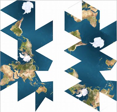 Wielościan foremny to inaczej bryła Platońska. Pomiędzy czworościanem, czyli piramidą o podstawie trójkąta równobocznego, a kulą, istnieją jeszcze cztery wielościany foremne – sześcian o kwadratowych ścianach, ośmiościan, jego ścianami są znów trójkąty równoboczne, dwunastościan o ścianach w kształcie pięciokątów foremnych oraz wspomniany dwudziestościan, ze ścianami ponownie w kształcie trójkątów równobocznych, najbardziej kulisty spośród kanciastych, najbardziej złożona z foremnych brył przed nieskończonościanem zwanym kulą. Na pomysł tej projekcji wpadł Richard Fuller, amerykański architekt, kartograf i filozof. Na widocznych powyżej dwóch wybranych rozłożeniach siatki widać po lewej masę lądową jako ciąg przyległych do siebie kontynentów, z kolei po prawej platoński – jeden ocean. Po środku wielkiego oceanu Platona leżała ogromna wyspa – Atlantyda.