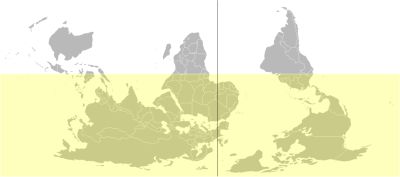 Poza odwracaniem mapy do góry nogami istnieje jeszcze zagadnienie wyboru miejsca przecięcia walca. Tutaj znów jesteśmy karmieni europocentryzmem. W Chinach, państwie środka, w centrum mapy jest Pacyfik, Australia oraz Chiny, a Europa, Afryka i Ameryki leżą na jej peryferiach. W takim rzucie widać kolejne fraktalne powtórki kształtów, które jak już wiemy stosuje natura, używając fraktali do budowy swoich zarówno małych jak i wielkich struktur. Do podobieństwa linii brzegowych Afryki i Ameryki południowej czy też seksownej powtórki europejskich mórz i półwyspów dołącza podobieństwo basenów Pacyfiku i Oceanu Indyjskiego do wielokrotnie powiększonej Australii. Według niektórych, te podobieństwa nie świadczą bynajmniej o kontynentalnym dryfie, ale zgoła różnym zjawisku, mianowicie o fakcie, że Ziemia rośnie. Ponieważ taka hipoteza zniweczyłaby podwaliny kilku dyscyplin naukowych, choć zasadna i zajmująco udowadniana, nie wygrywa z obecnym paradygmatem.