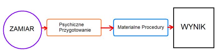 Na początku mamy zamiar (właściwie, czystą myśl), na końcu wynik (istniejący materialnie-realnie). Po drodze idą dwa procesy. Pierwszy nazwałem psychicznym przygotowaniem, drugi materialnymi procedurami. W podejściu inżynierskim cały nacisk kładzie się na materialne procedury. Chcesz mieć dom, to szukasz w gminach lub agencjach nieruchomości odpowiedniej działki, odrolnionej i uzbrojonej, kupujesz, zamawiasz projekt u architekta, zlecasz firmie budowlanej, budują ci, itd. – i masz. Wynik stoi. W podejściu psychologicznym nacisk kładzie się na psychiczne przygotowanie, zakładając, że materialne procedury się znajdą, jest ich wiele i nie stanowią problemu. Problemem jest co innego, co (dziwnym trafem) zauważył wspomniany Wyspiański w „Weselu”: „Ale oni nie chcom chcieć!”, jak powiedział osiłek Czepiec do inteligenta Dziennikarza. Psychiczne przygotowanie polega właśnie na tym, żeby coś takiego ze sobą zrobić, żeby chcieć chcieć.