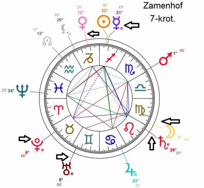 Dane i horoskop Zamenhofa znalazłem w tym gigantycznym katalogu AstroTheme, ale bez godziny, godzina nie jest znana, wobec tego horoskop jest narysowany z zerem Barana po lewej stronie. Brak godziny nam niewiele zmienia, ponieważ planety, jeśli były w pewnym punkcie siedmiokrotnym, to raczej w ciągu jednej doby nie wyjdą poza ten punkt. Wątpliwy może być tylko Księżyc. Strzałki pokazują punkty siedmiokrotne w horoskopie Zamenhofa. Punt około 12 stopni Wagi niestety nieszczęśliwie nie jest obsadzony żadną planetą... Ale... oprócz tego wszystko się zgadza!