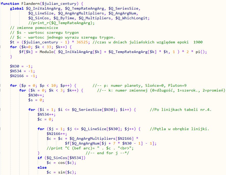 Funkcję liczącą pozycje planet według wzorów F&P nazwałem po prostu „Flandern”. Jest dość prosta, tu na obrazku widzisz około 60% jej kodu: