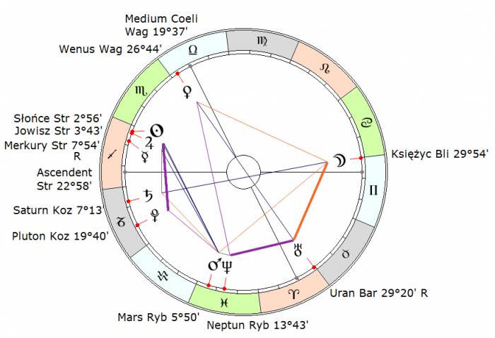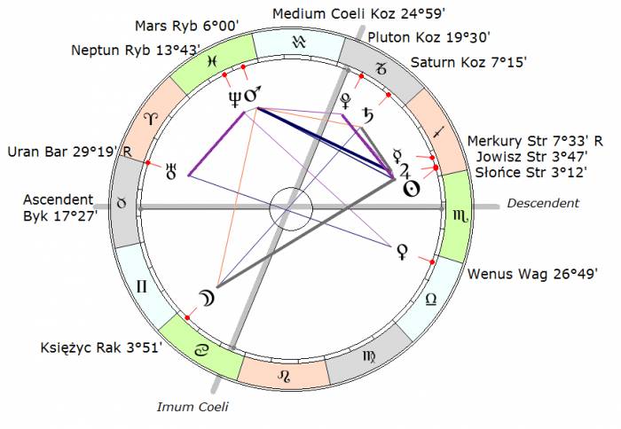 Tr. kon. Słońce-Jowisz (3’ Strzelec) - sekstyl + kwinkunks - ur. kwadrat kon. Słońce-Merkury (3’ Waga) - Jowisz (0’ Rak).