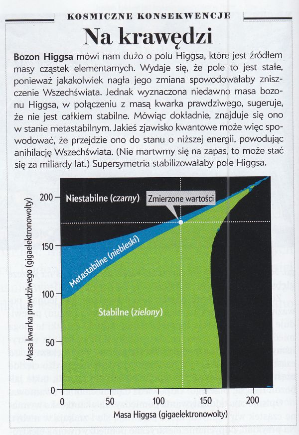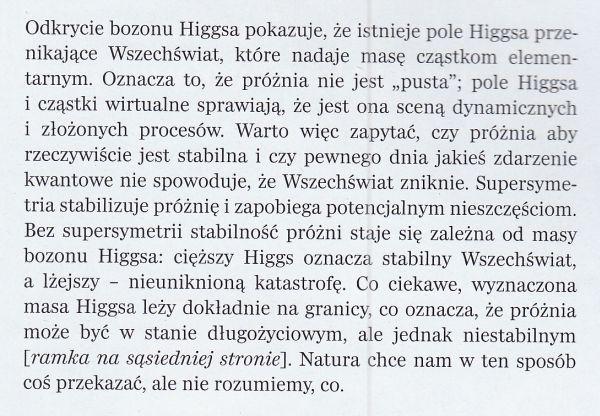 Wprawdzie nie rozumiem, i autorzy nie wyjaśniają, dlaczego stabilność pola Higgsa jest powiązana z masą kwarka prawdziwego (słówko „prawdziwy” w nazwie kwarka jest czysto umowne, tak go nazwano ku czci jednej z cnót), ale nie wchodźmy w szczegóły. W każdym razie pole Higgsa jest metastabilne, czyli... stabilne do jakiegoś czasu. Co oznacza, że sam bozon Higgsa, taki jaki jest, lub raczej taki, jaki wyszedł z niedawnych pomiarów, nie może „tamować” wszechświata przed rozpadem. Żeby świat się nie rozpadł - musi mieć silniejsze zabezpieczenie. Tym zabezpieczeniem powinna być supersymetria. Ale jej istnienia, w postaci istnienia cząstek z tego drugiego zestawu, nie znaleziono! Więc co? Świat wisi tylko na cienkiej nitce Higgsa, która może się w każdej chwili zerwać? I WSZYSTKO obsunie się w Nicość?
