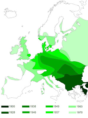 Z mapy tej widać, że synogarlice upodobały sobie region Międzymorza (plus Niemcy). Szybko zajęły Bałkany, ale zatrzymały się „u wrót” Włoch, chociaż klimat jest tam właściwie ten sam. Straciły impet we Francji i na Półwyspie Iberyjskim, chętniej za to zajęły chłodniejsze i mokrzejsze Wyspy Brytyjskie, które na pewno mało im przypominały rodzinną Turcję. To, że mapa pokazuje ich wejście wcześniej do Niemiec (do 1949) niż do Polski (do 1957) wynika z braku danych z powojennej Polski lub stąd, że niemiecki autor mapy nie miał do tych danych dostępu. Kraków powinien być zamalowany na ciemnożółto!