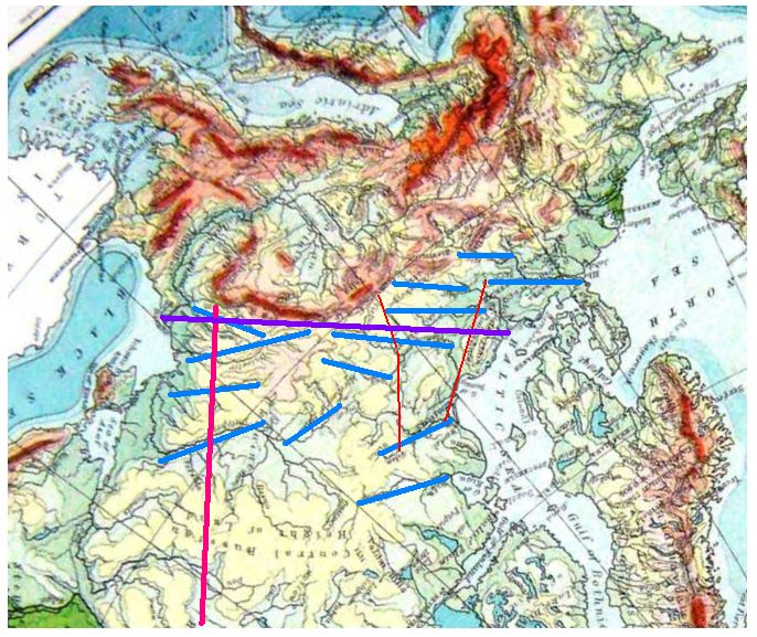 Purpurową linią zaznaczyłem granicę Lasu i Stepu. Dziwnym trafem idzie ona prostopadle do krawędzi Baltiki. Cienkimi czerwonymi kreskami zaznaczyłem linie historycznych centrów i ich powiązań: w środku linia Kraków-Warszawa-Wilno, po prawej linia Berlin-Królewiec. Też z grubsza idą one prostopadle do Teisseyre'a-Tornquista, równolegle do las-step.