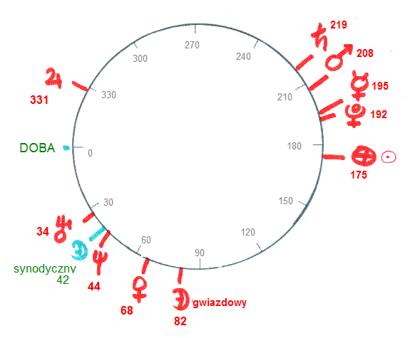 Poniższy wykres przedstawia częstotliwościowe kąty planet naniesione na okrąg: