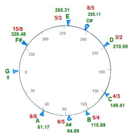 Aby uszanować przyzwyczajenia astrologów, zapewne większość czytelników tego artykułu, zero na skali zaznaczyłem po lewej, tam gdzie w kosmogramie jest punkt Barana; podobnie koło podzieliłem na odcinki po 30 stopni, jakby to były znaki zodiaku. Nie jest to całkiem bez sensu, gdy chodzi o muzykę! - o czym później.