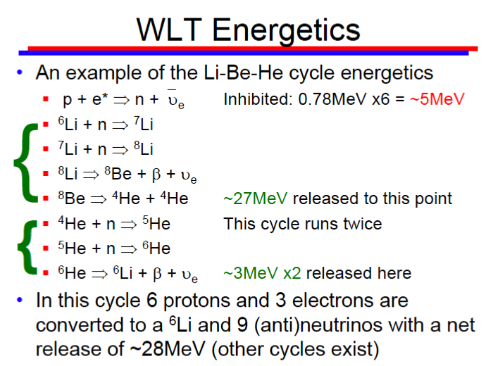 Proton, (najprawdopodobniej wzięty z podstawowego izotopu wodoru, który jest zaabsorbowany w wodorku metalu) zostaje pobudzony „ciężkim elektronem” podczas impulsu elektromagnetycznego o natężeniu co najmniej 1000V/m. Wg tej teorii proton przekształca się wtedy w neutron i (anty)neutrino. Z czym, że zostaje dostarczona energia do wytworzenia 6 takich reakcji na jeden „cykl” – 6 x 0,78MeV = 5MeV. Następnie w izotop litu 6 uderza neutron dając lit 7, w ten również uderza neutron dając lit 8. Lit 8, niestabilny izotop przekształca się w neutrino i beryl 8, a ten o rozpadzie połowicznego rozpadu jeszcze krótszym natychmiast w dwa atomy helu4. Po kilku sekundach nie ma już śladu po Li 8 ani Be 8. Natomiast hel mimo, że jest stabilny jest lekkim gazem znikającym z reaktora gdy tylko ten zostanie otwarty. Zresztą lotny wodór również nie został wykryty po teście, który wcześniej znajdował się pod postacią wodorku metalu.