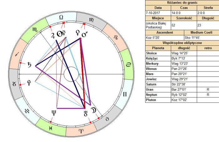 Ciekawy jest kosmogram akcji „Różaniec do granic”. Do wykreślenia przyjąłem godzinę 14:00, bo ten czas był wymieniany w wiadomościach, również jako moment przejaśnienia, kiedy deszcz przestał padać i pojawiły się znaki od Boga czyli tęcze w różnych miejscach. Miejsce jest nie całkiem określone, więc także rozmieszczenie planet względem horyzontu (Asc.) i południka (MC) nie jest istotne. Istotne są aspekty i położenia zodiakalne. Data: sobota 7 października 2017.