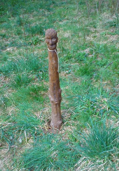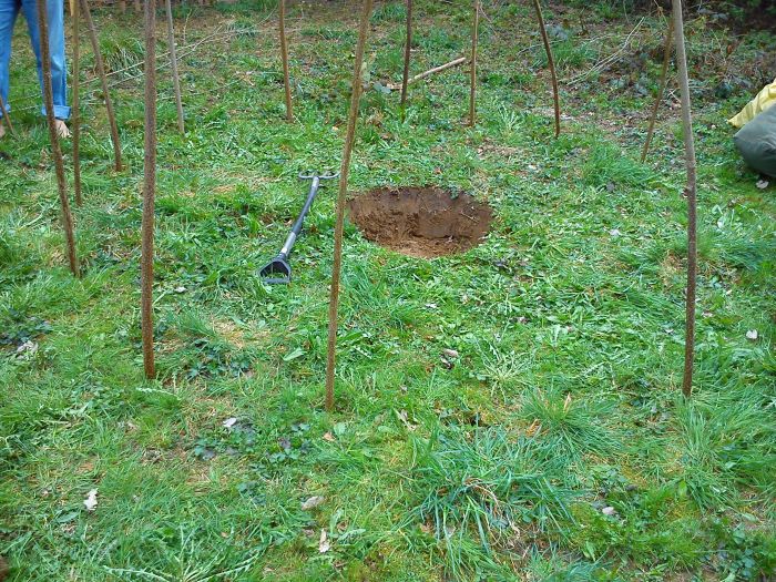 Miejsca na szałas już wybrane. Środkowa jama, gdzie będą włożone gorące kamienie, już wykopana. Widły, które tu leżą, służą jako miara średnicy szałasu. Wbijamy kije, z których będzie szkielet szałasu. Kije są gatunku extra-super: są to proste pręty wycięte z miejscowych krzewów leszczyny. (Leszczyna rosnie tu bujniej niż w Poslce!) To ma jeszcze te zaletę, że przy okazji pozyskiwania kijów nie zniszczyliśmy ani jednego drzewa, gdyż te pręty to gałęzie. Także ziemia była bardzo dobra do takich prac: w miejscowej glinie kije stały prosto, nie trzeba było ich trzymać, ani dodatkowo mocować. (Na mazowieckim piasku nie bywa tak dobrze.)