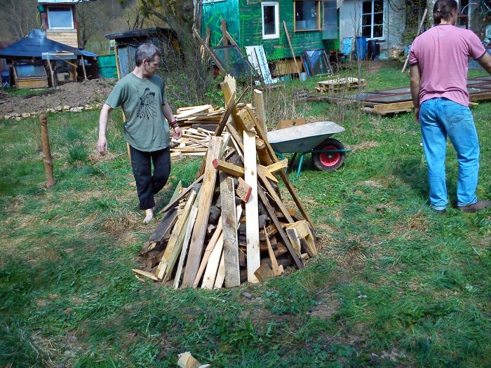 Stos, w którym wygrzewane będą kamienie. Znów kompromis: mieliśmy dostęp tylko do takiego drewna, które tu widać: odpadowe deski, głównie z palet. Do tego (brrr...) z gwoździami. Prawdę mówiąc, nie radzę tego... Drewno cięte i wbijane gwoździami wnosi „niekorzystną energię”. Ale, zapewne dzięki ochronie miejscowego silnego „magicznego pola”, wspieranego przez jeże, chomiki i naszego idola, ceremonia udała się nad podziw dobrze!